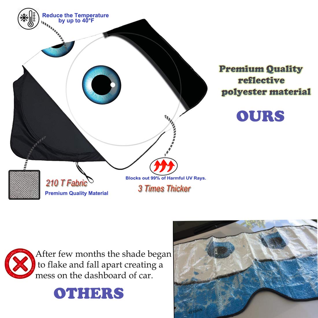 - Funny Eyes Design Makes Your Vehicle Special under Sunshine. Funny visor reflects personality and attitude. Get rid of miserable with your car from harmful UV radiation rays.